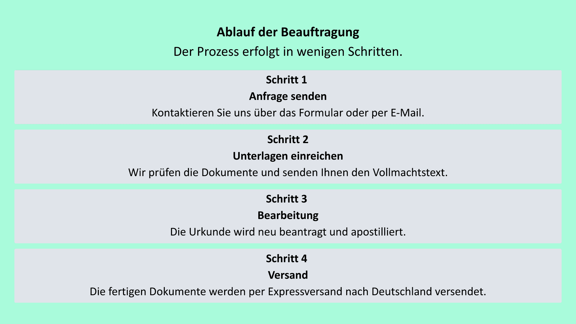 Wenn Sie eine Urkunde aus Kasachstan mit Apostille beschaffen möchten, senden Sie uns bitte eine Anfrage. Wir informieren Sie anschließend über die nächsten Schritte.